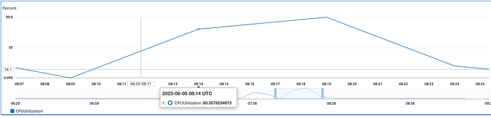 This suggests that during the 10 minutes interval, CPU utilisation reached 80 percent and then went up till more than 99 percent and slowly came down towards 20 percent.