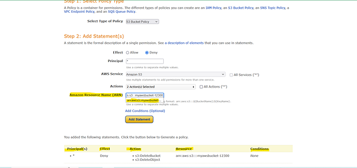 Step2. statement — effect = Deny principle : * Action -: Delect bucket Amazon Resource Name: ARN = [ ]
