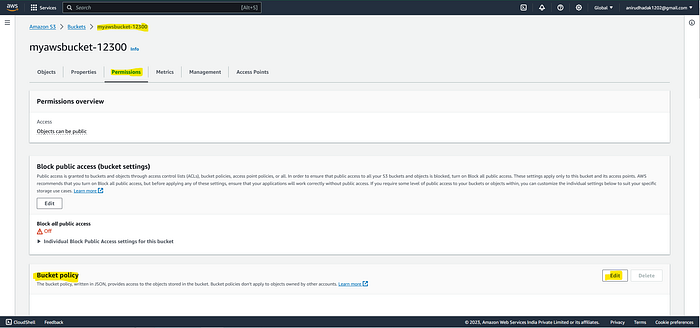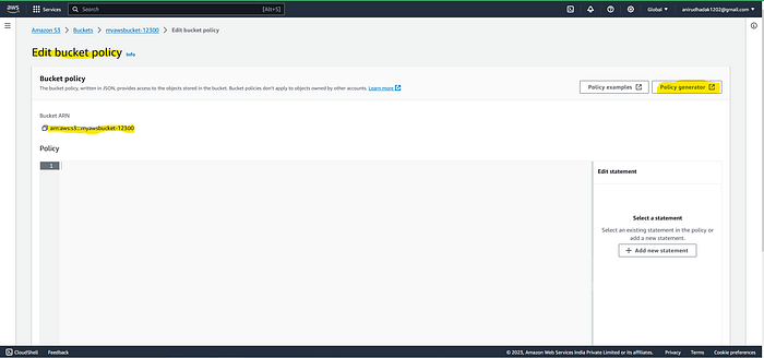 In Bucket permissions > Bucket Policy is there click on ‘Edit’