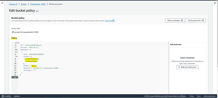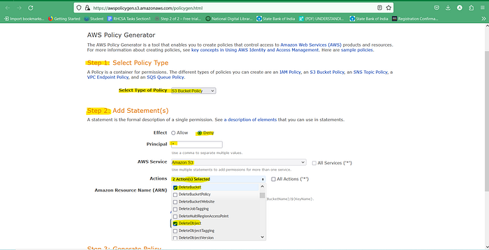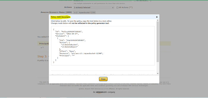 => policy Generator Step1. Select policy type => s3 bucket policy Step2. statement — effect = Deny principle : * Action -: Delect bucket Amazon Resource Name: ARN = [ ] Add Statement Generate policy : copy policy Json document paste in Edit Bucket policy [Save changes]