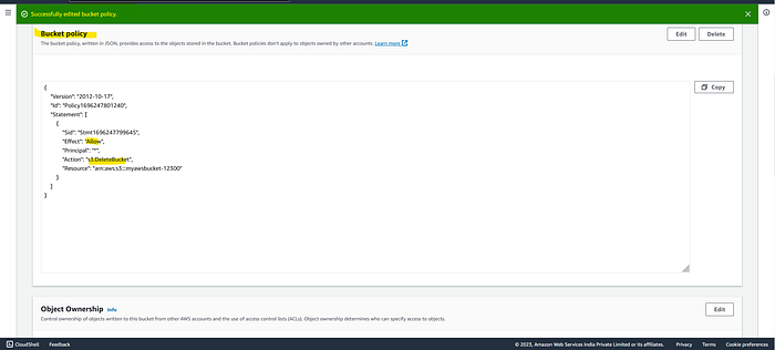 Now , try to delete bucket → you don’t have permission to delete bucket due to deny policy , deny to delete.