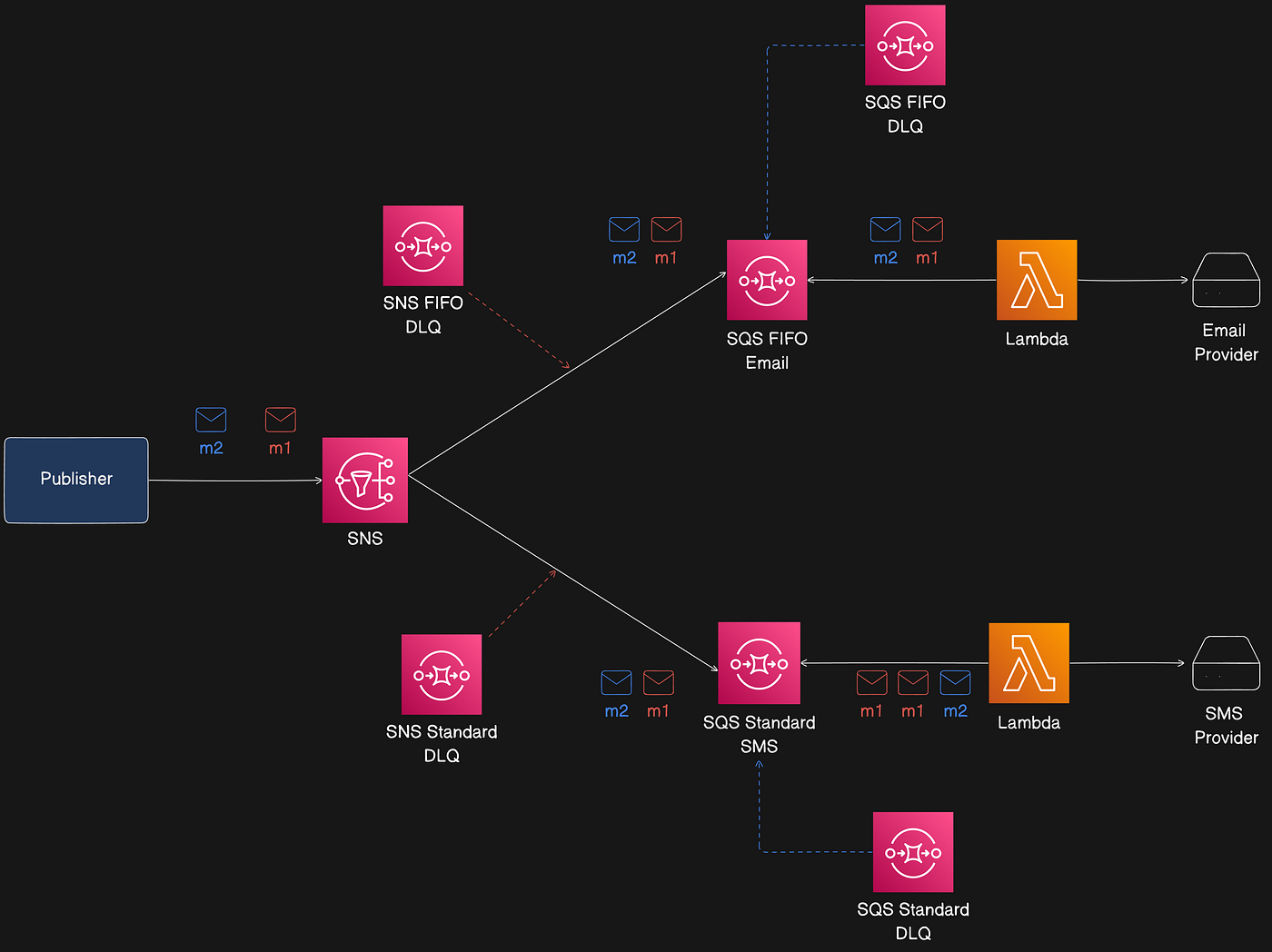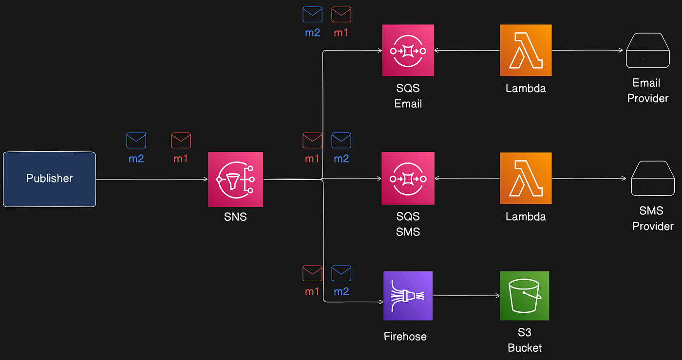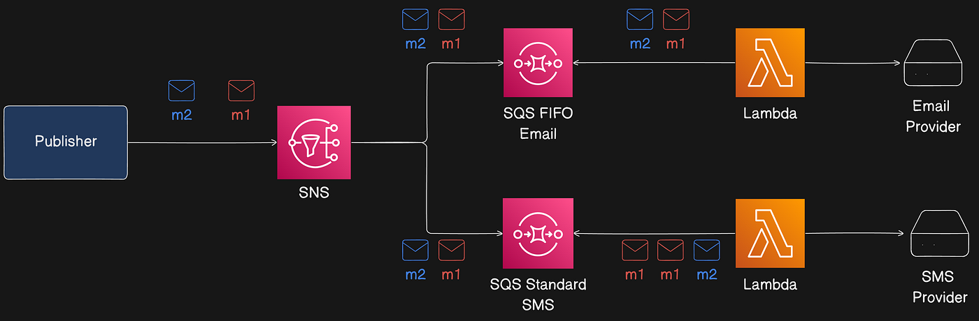 Reference architecture: a notification flow where SNS fans out messages to multiple consumers (primarily SQS queues) that hold messages until processing.