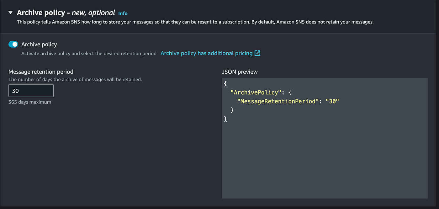 Message archiving — enable archiving on the topic and set a retention period (up to 365 days). Monitor archived messages via CloudWatch.