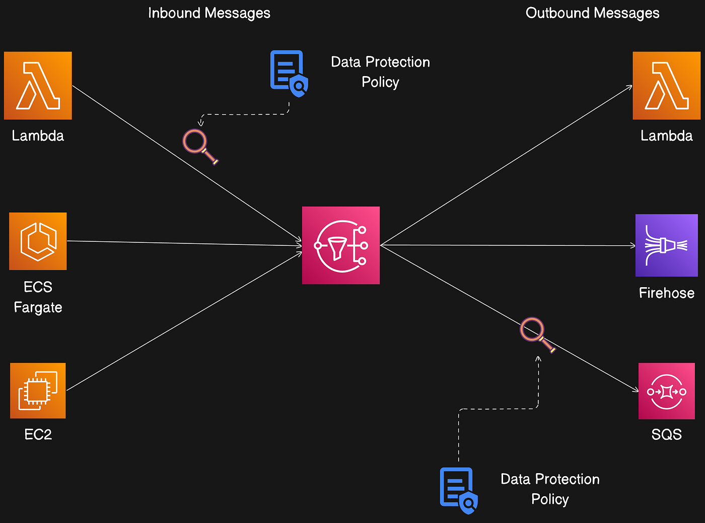 MessageAttributes— filter policy applied to message attributes (default).MessageBody— filter policy applied to the message body (requires JSON payload).