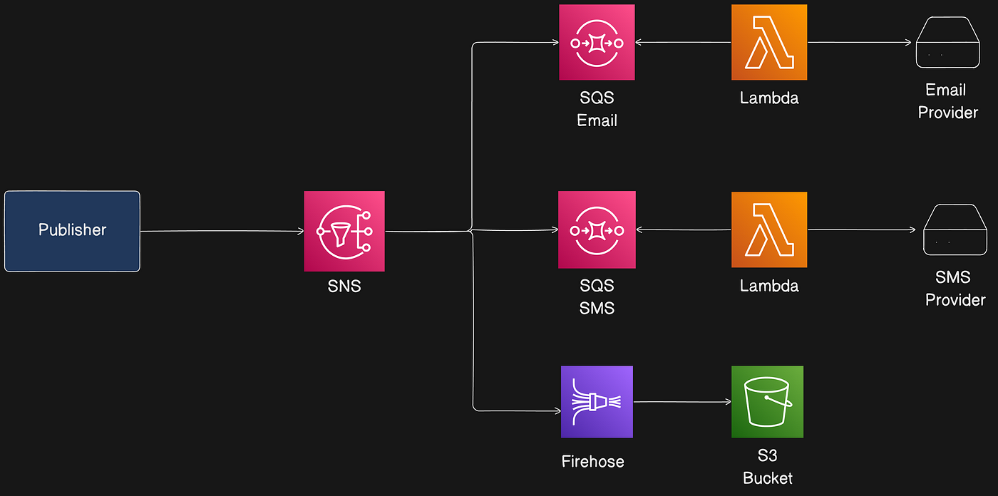 Flows include email notifications, SMS notifications, and a Firehose flow to S3 for analytics.