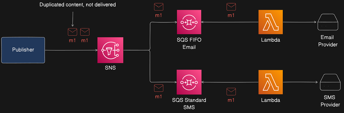 Standard topics use at-least-once delivery; duplicates can happen (e.g., publisher retries due to lack of acknowledgment). Subscribers must handle idempotency (for example, include a UUID in message attributes).