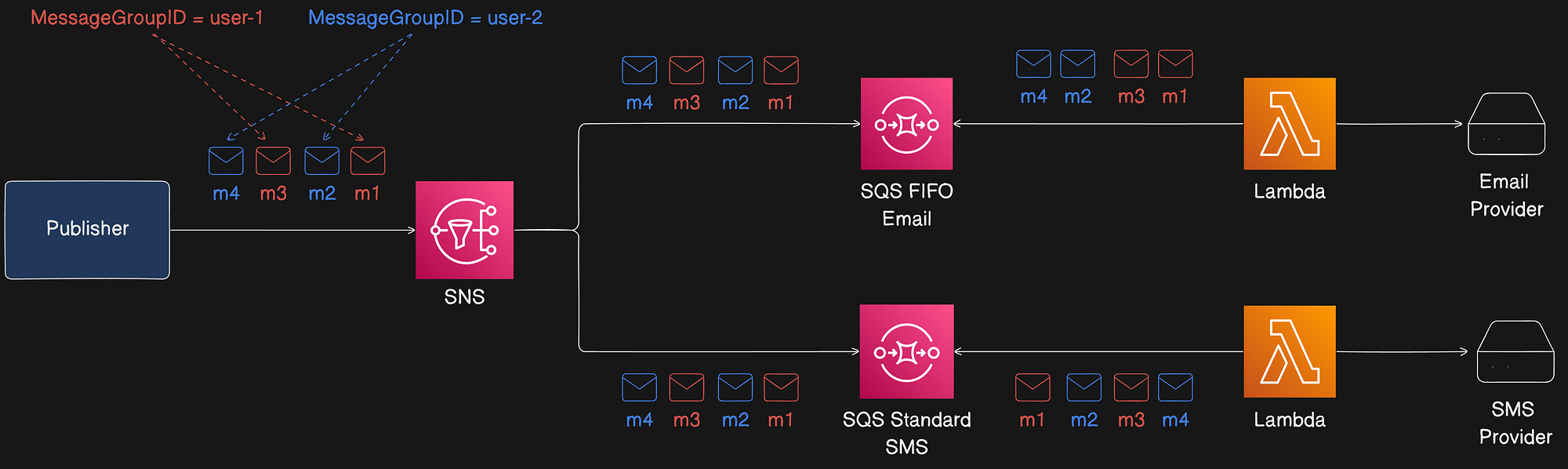 Example: preserving per-user ordering by using userId as MessageGroupId.