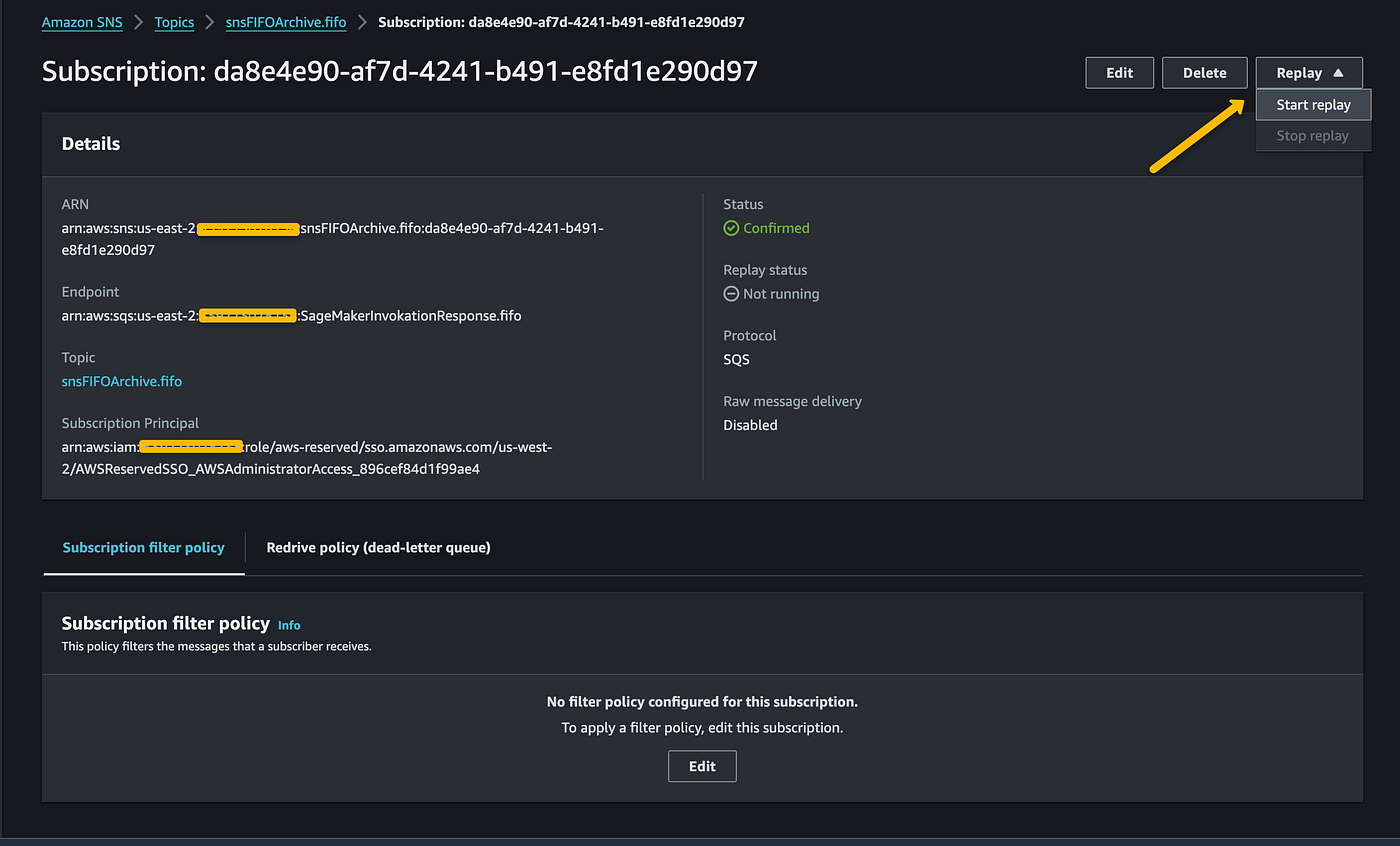 SNS subscription has no message filtering (filtering causes at-most-once delivery because messages can be filtered out).