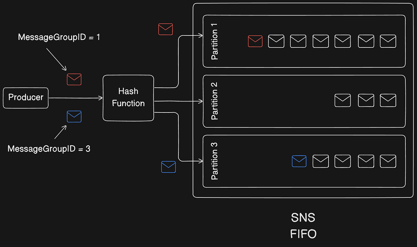 MessageGroupId: for FIFO topics, required; tags a message to a specific message group for FIFO ordering.
