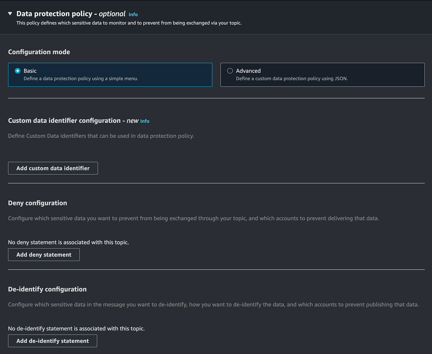 Data protection policies select which sensitive data to scan (via data identifiers) and the action to take (audit, de-identify, deny). SNS uses ML and pattern matching to detect sensitive data.