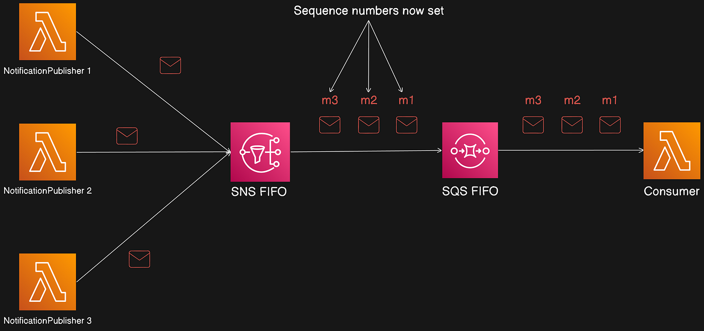 Multiple publishers can publish in parallel to an SNS FIFO topic. SNS assigns a 128-bit sequence number to each message (increasing per Message Group). The sequence number is included in messages delivered to SQS queues unless raw message delivery is enabled. Sequence numbers help determine ordering.