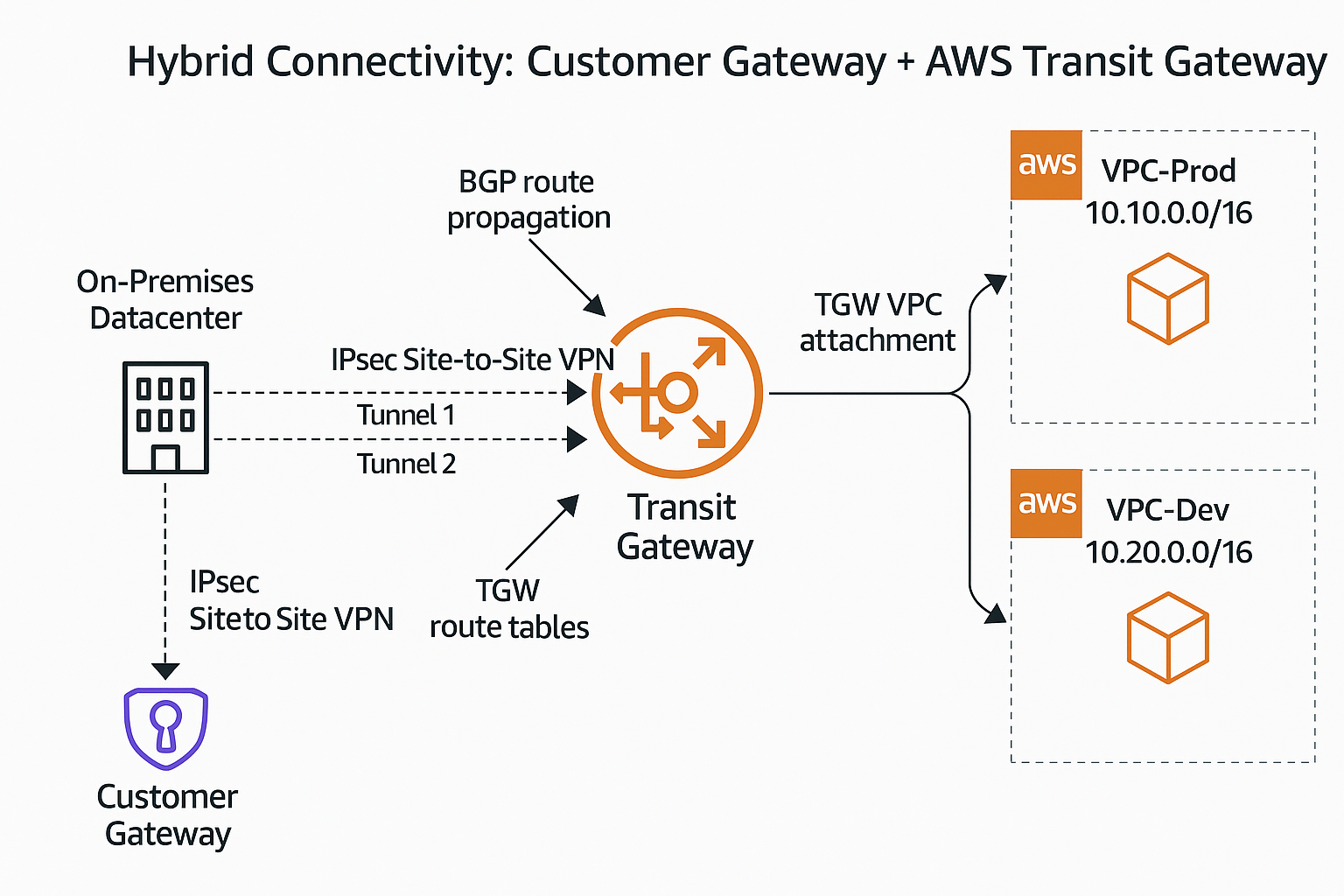 AWS cloud deployments often need to integrate seamlessly with on-premises data centers while still supporting rapid growth across many Virtual Private Clouds (VPCs). A powerful pattern for achieving this is the combination of an AWS Transit Gateway (TGW) on the AWS side and a Customer Gateway (CGW) on the on-premises side. This report dissects the technologies, shows a realistic end-to-end scenario, and presents an annotated architecture flow diagram. Every section is packed with implementation guidance, performance tuning tips, security safeguards, and operational best practices.
