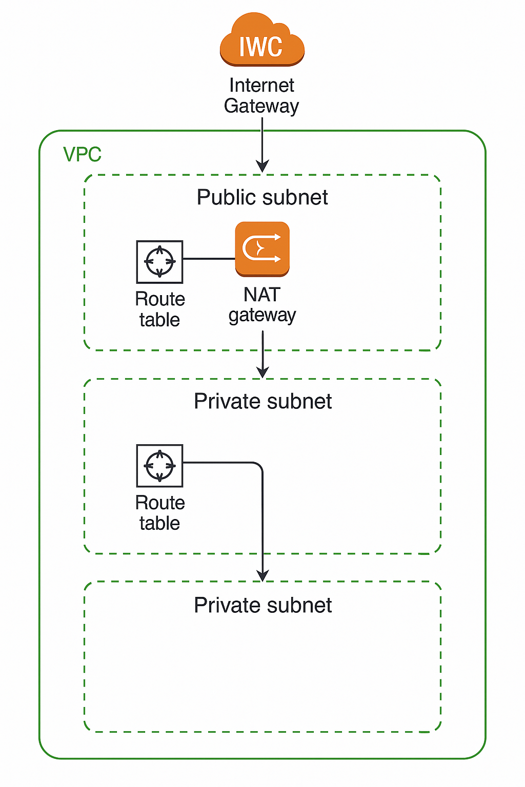 Route tables serve as the traffic controller for your VPC, containing a set of rules called routes that determine where network traffic is directed. Each route specifies a destination CIDR block and a target (such as an Internet Gateway, NAT Gateway, or VPC peering connection).
